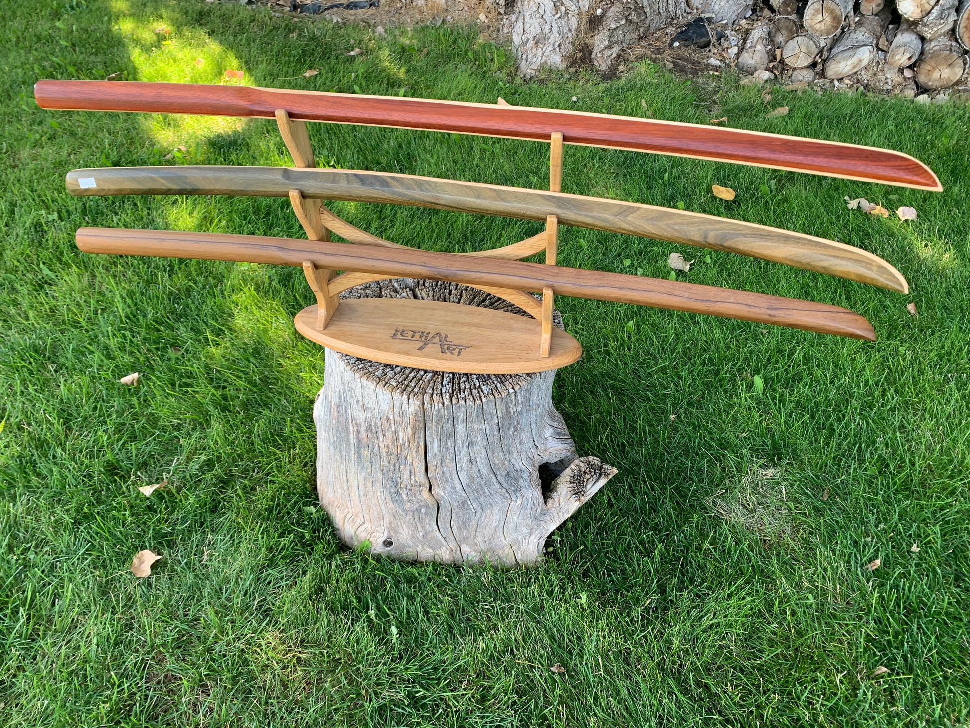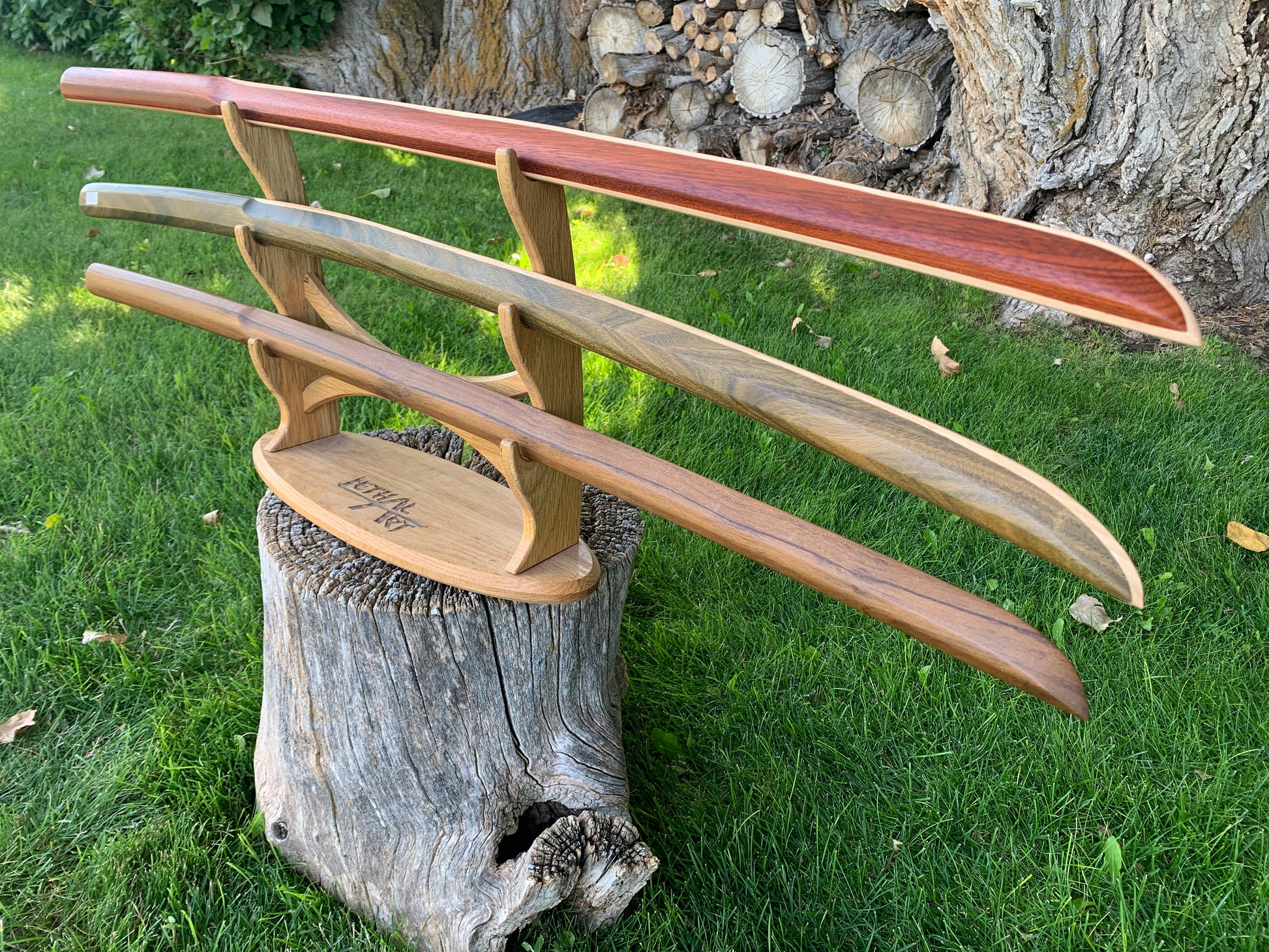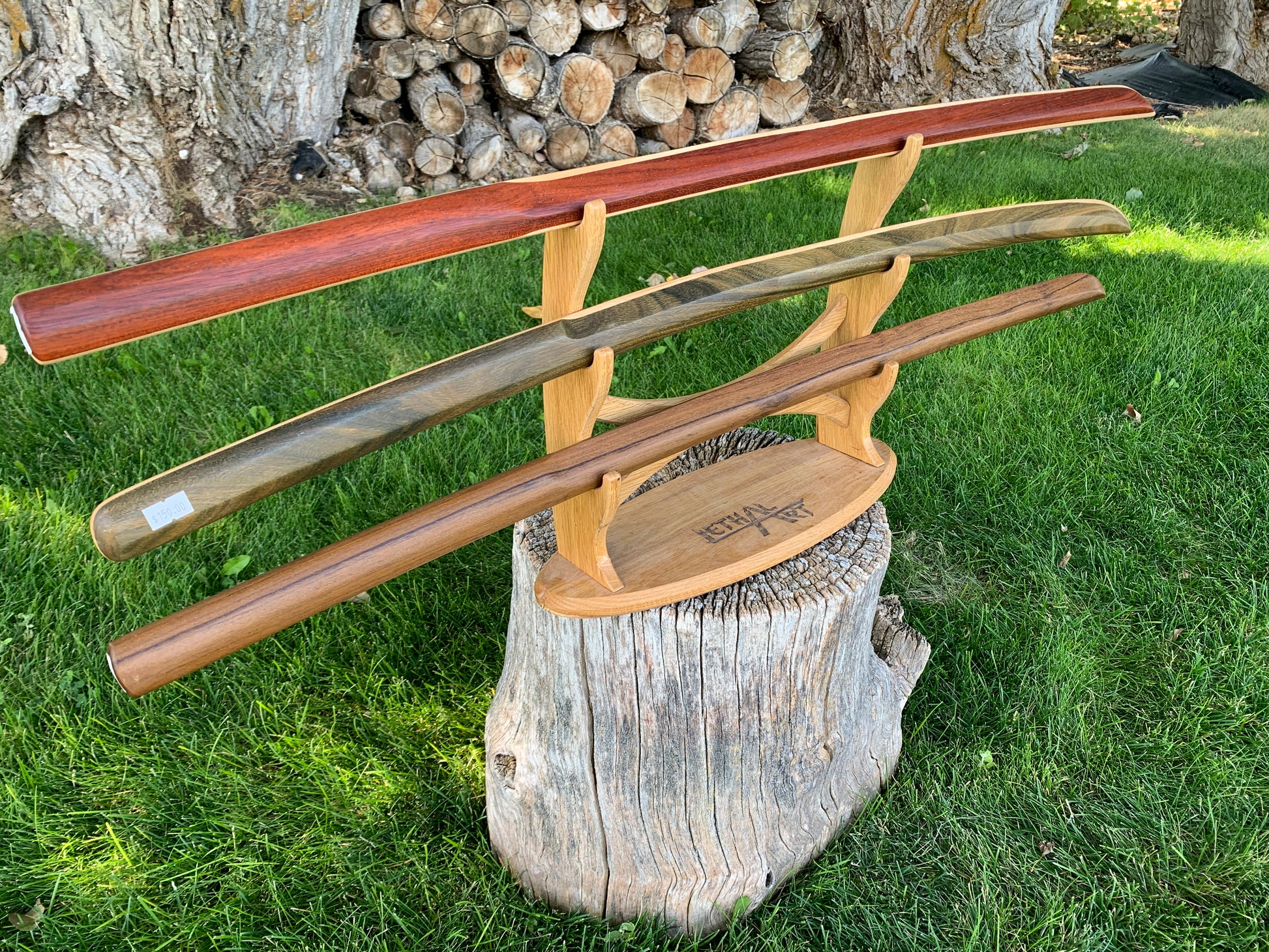 Discover the Bokken Batch #6 - Laminated Assortment, featuring three handcrafted bokken designed for durability and performance. The top bokken combines rich Bloodwood scales with a strong maple core, the middle showcases Verawood scales over a resilient hickory core, and the bottom is crafted from solid Ipe, known for its toughness. Each piece offers unique strength and balance, making this assortment perfect for practitioners seeking quality and variety in their training weapons. Elevate your skills with these meticulously crafted bokken.