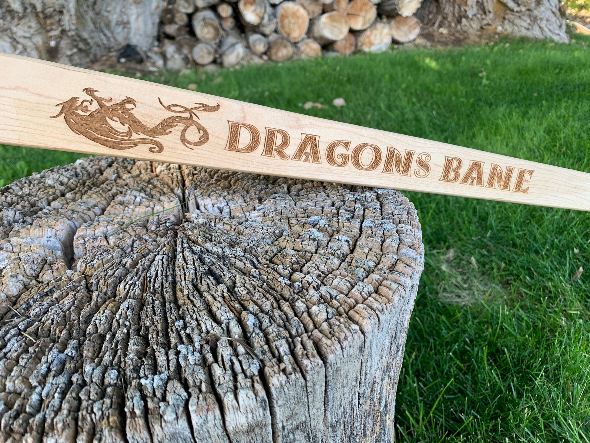 Unleash your inner warrior with this handcrafted European one-handed training sword. Featuring a durable maple blade engraved with a fierce dragon and the bold name "Dragons Bane," it brings excitement to every practice session. The oak handle and guard offer a comfortable grip and solid protection, making training both effective and fun. Perfect for those who want to develop skill with a sword that’s as inspiring as it is practical.