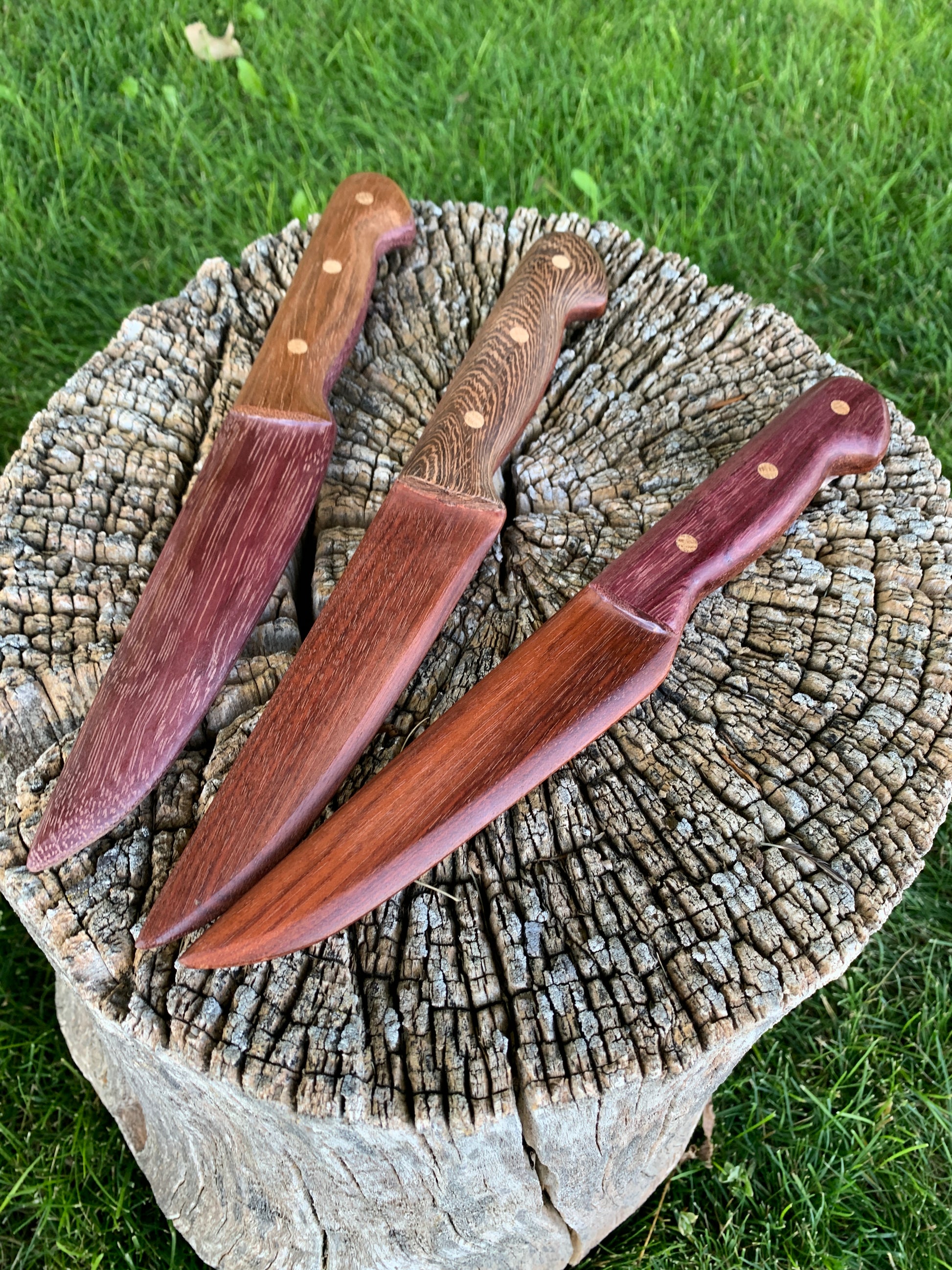 Discover exceptional craftsmanship with our Training Knife Batch #1, featuring three distinct handcrafted options. Choose from a Purpleheart blade paired with a smooth Mahogany handle, a striking Bloodwood blade matched with a rich Wenge handle, or the unique combination of a Bloodwood blade and Purpleheart handle. Each knife is expertly crafted to offer durability and balance, perfect for safe, effective training. Elevate your practice with a training knife designed to inspire confidence and precision in every move.